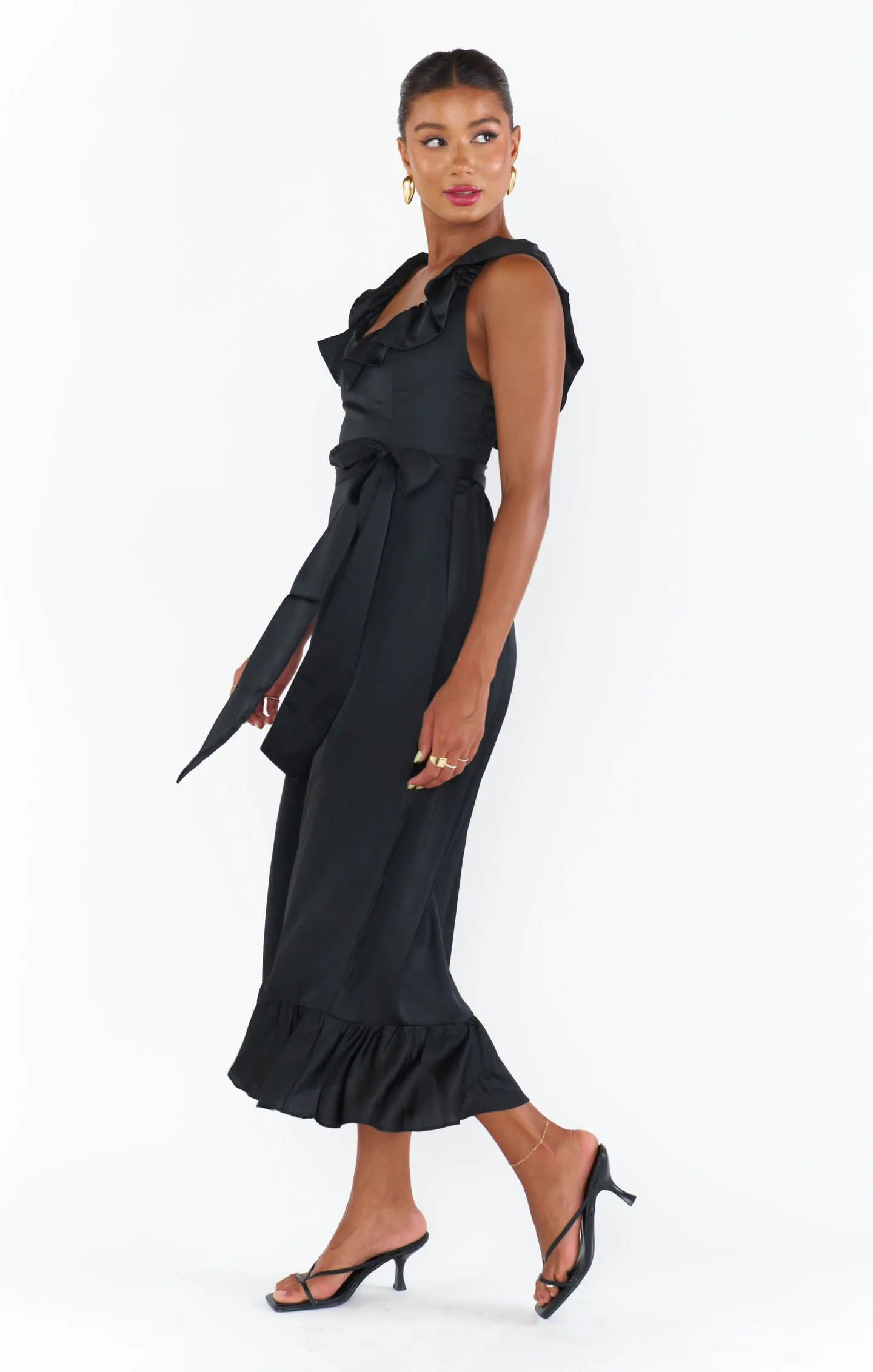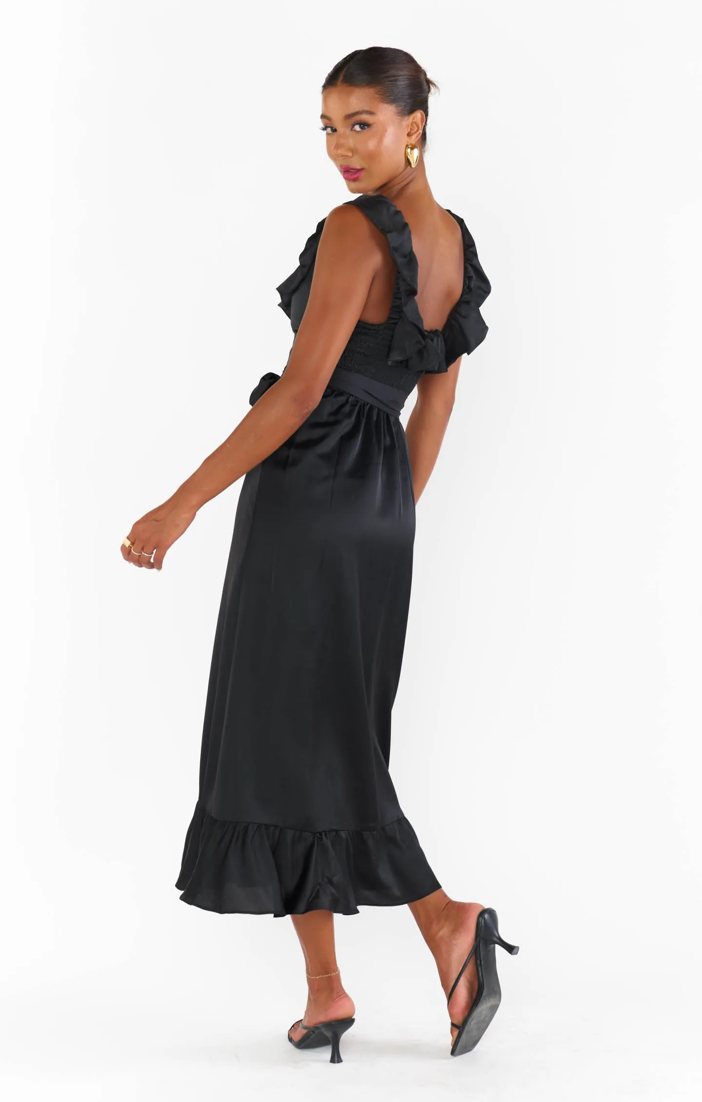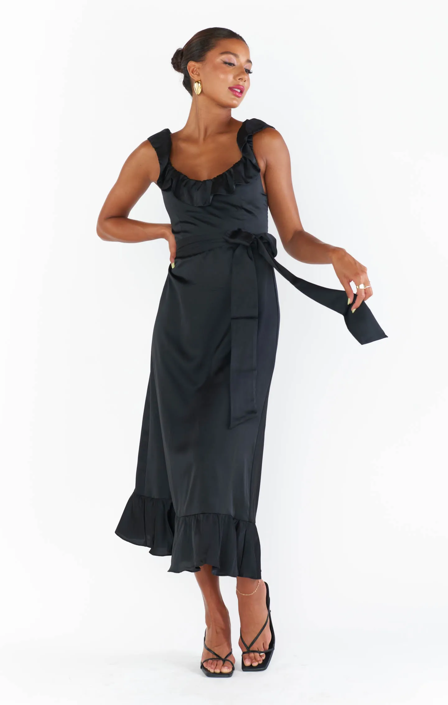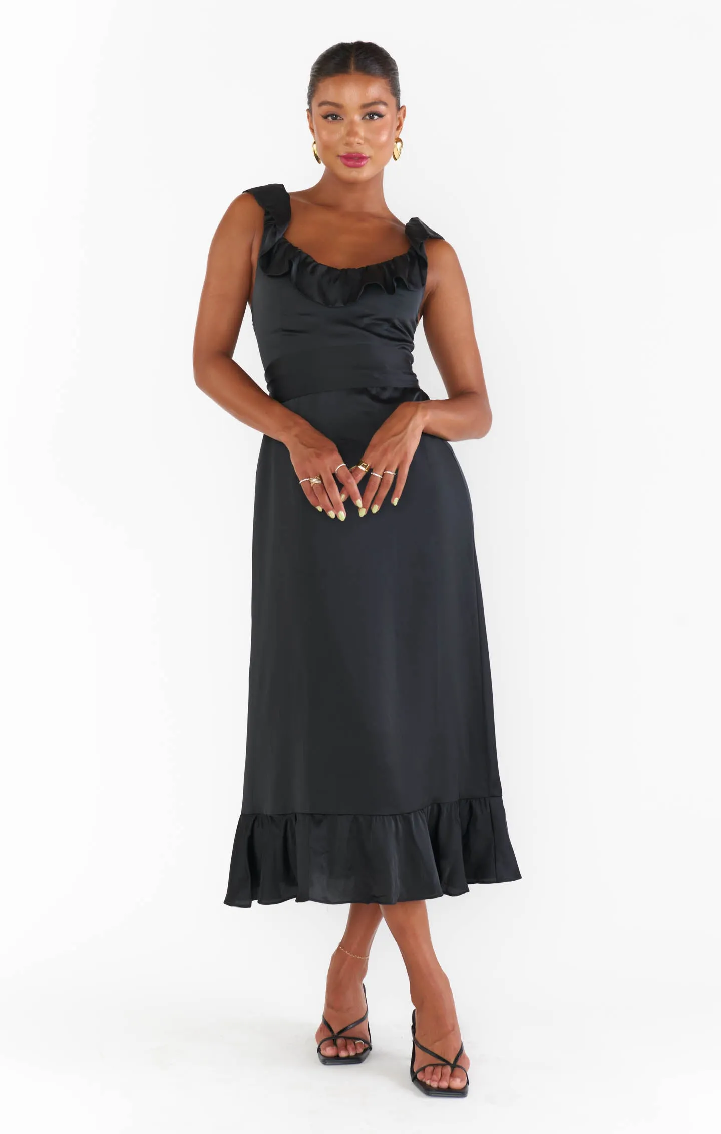 Ruffled to perfection, this luxe satin dress isn't your everyday midi! A square neckline and tank top straps lay the foundation for a simple silhouette, while dainty details including a waist ribbon and smocked back elevate it. Show up and show out at all this seasons events.