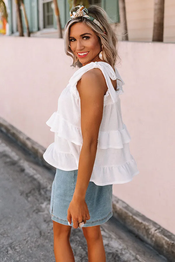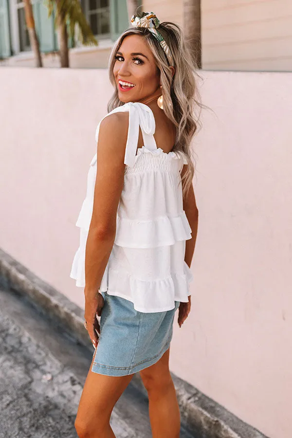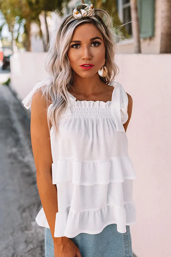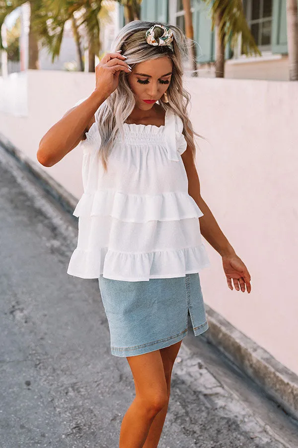 There is no better top to wear when you are bound for the Amalfi coast than this adorable white shift tank featuring lightweight material, a smocked square neckline an upper back, ruffled detailing on the trim and tiered accent seams, tied 1-inch shoulder straps, and a relaxed silhouette that falls into an uneven hemline! We have styled this dreamy piece with a light wash denim skirt, a headband, and neutral wedges, but you can also wear it with some charcoal flares, "The Lela Espadrille in White," and our "Spanish Coast Fringe Crossbody in Grey!"