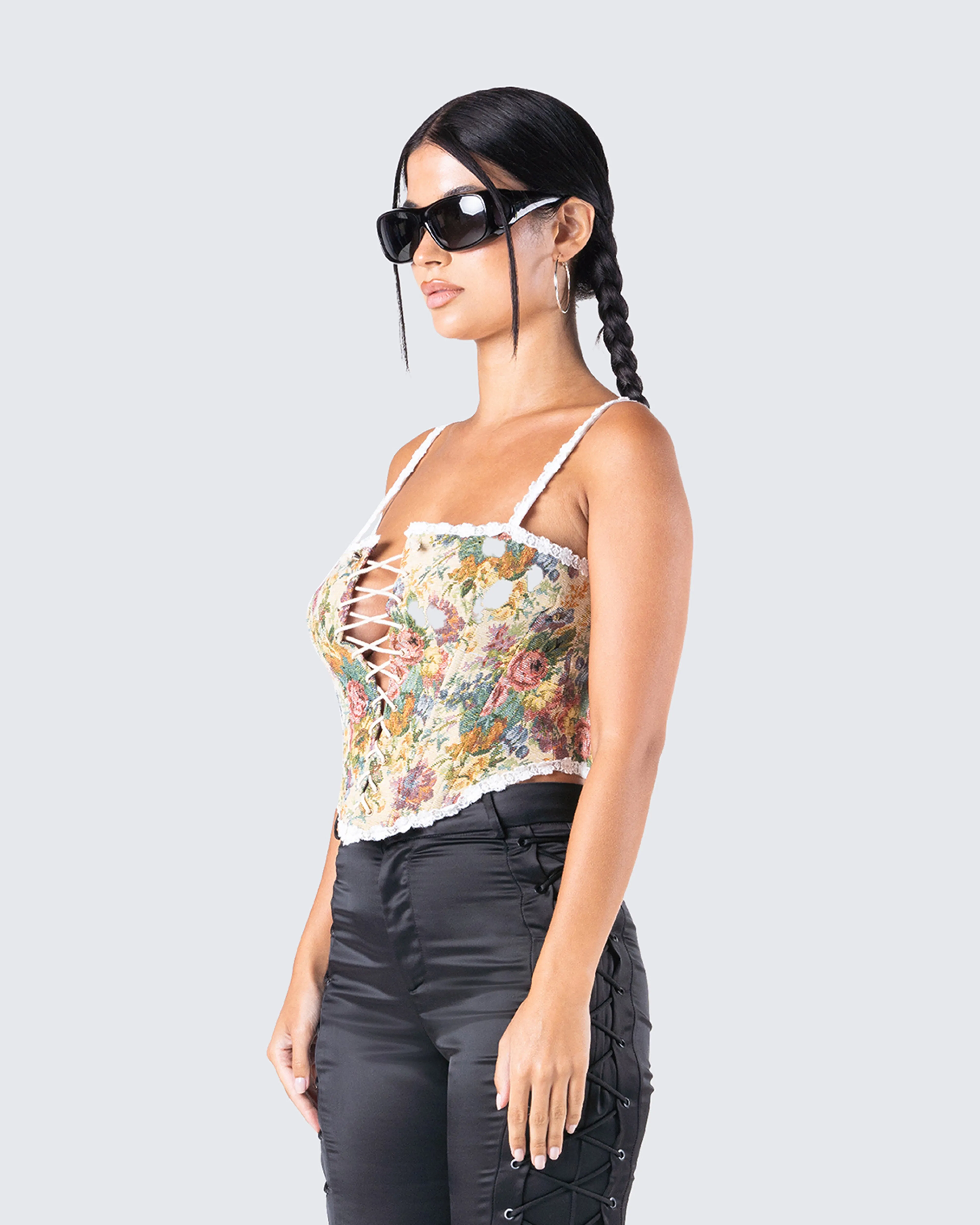 How do you say “queen” without actually saying it? Show up in a corset with all over embroidery that will make their jaws drop as they sink to their knees 👑