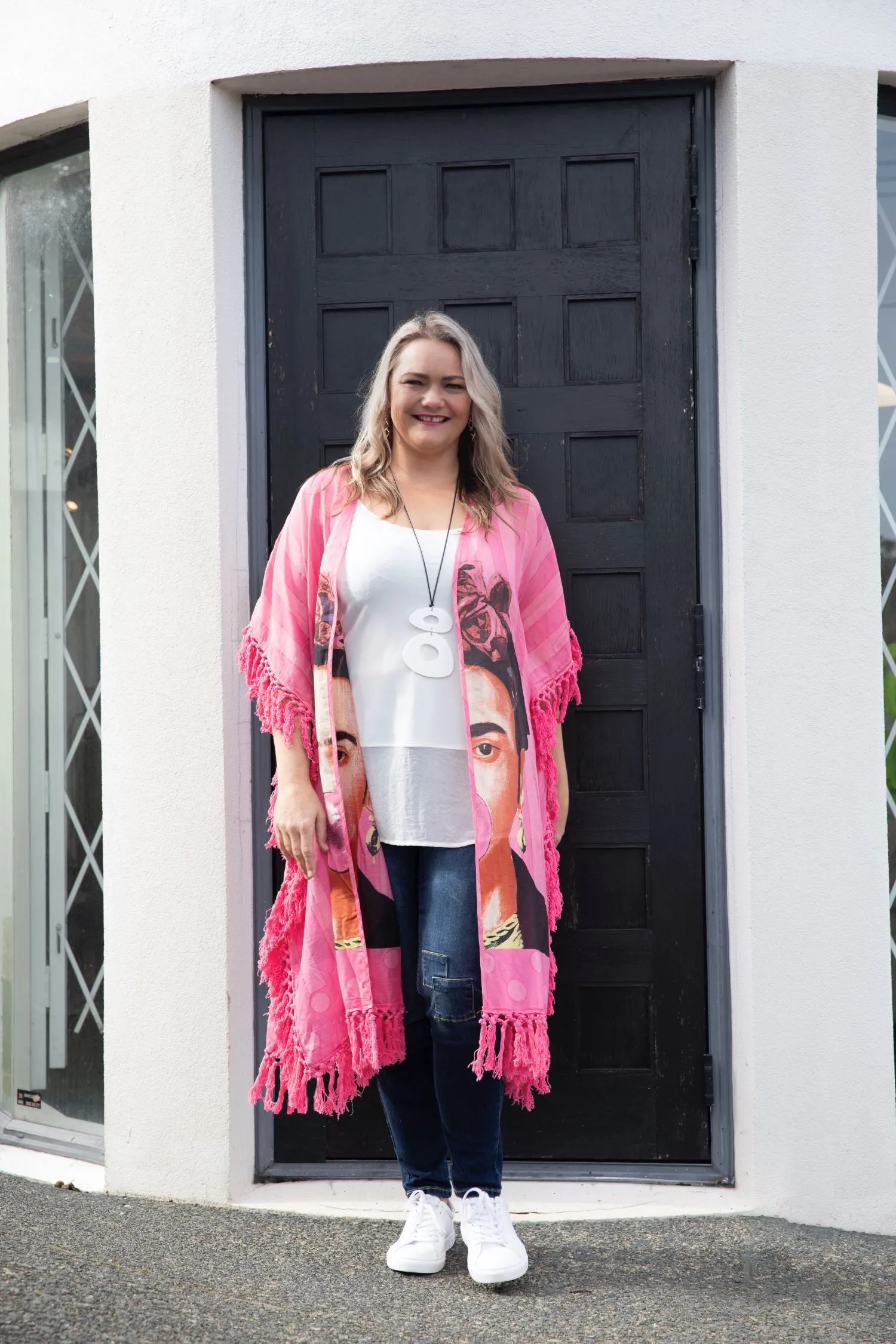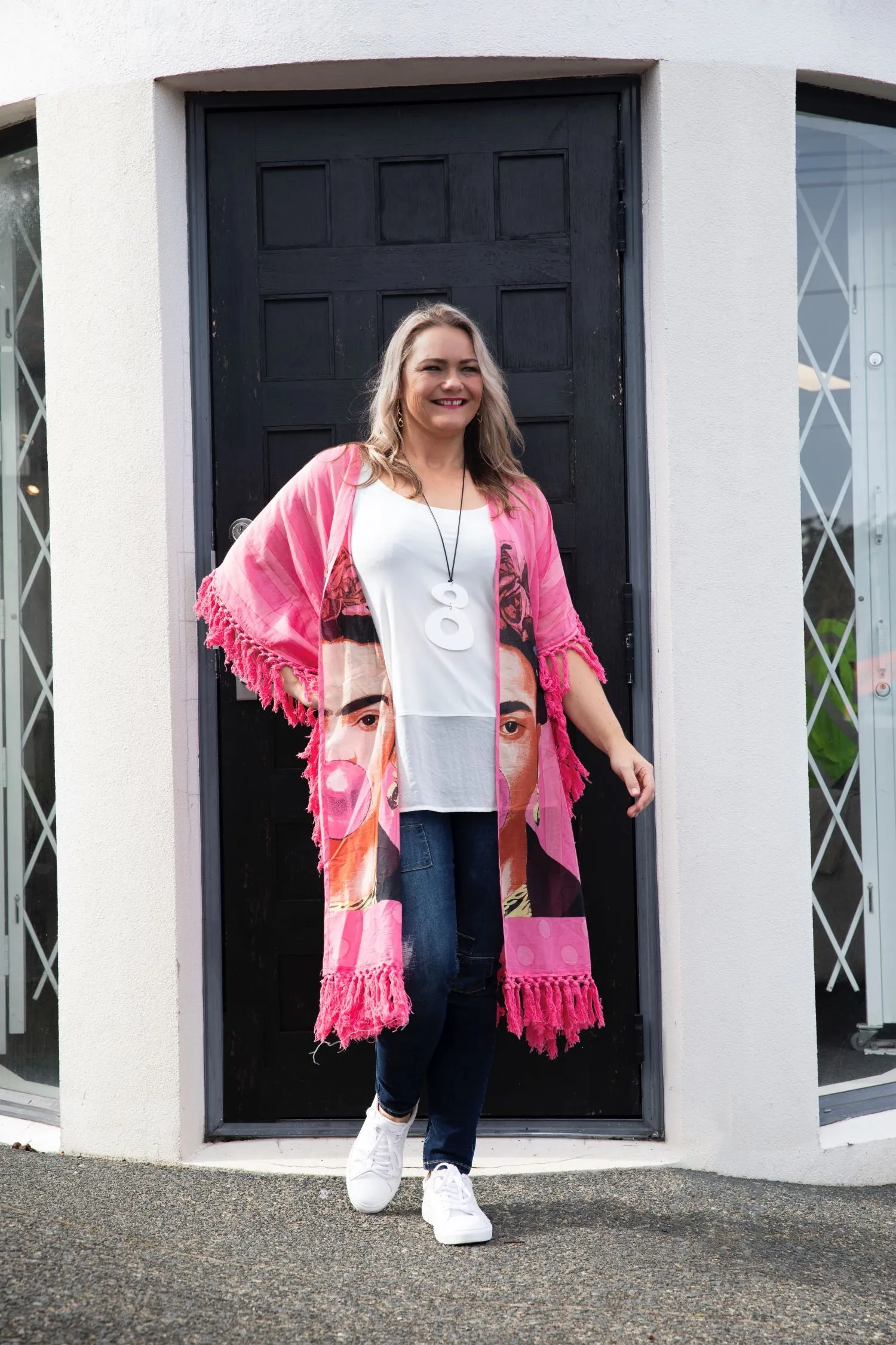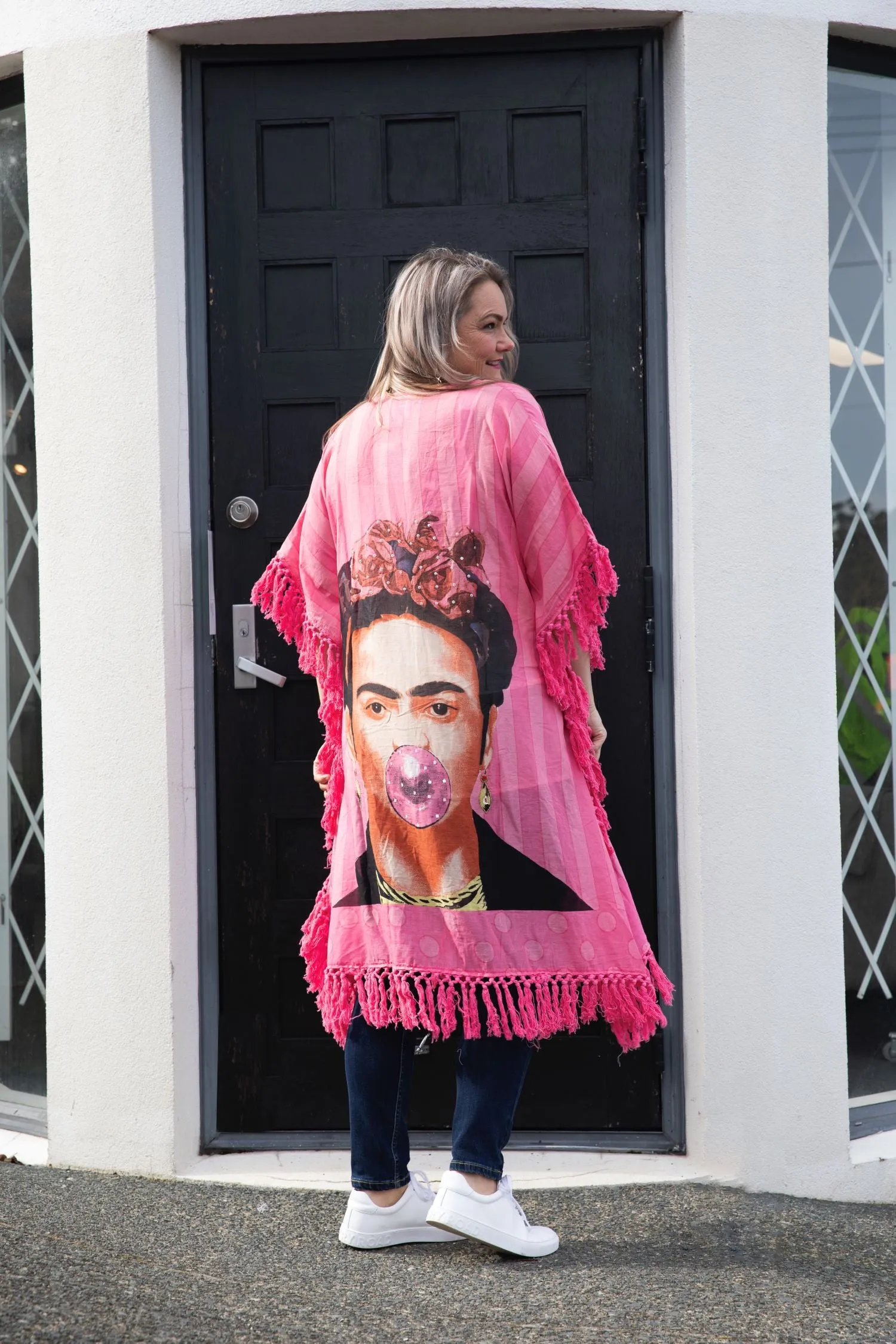 New to Magazine, Barok Paris Kimonos are all set for poolside glamour and fun in the sun! Cut in soft handle cotton voile, these one size dress up dress down kimonos are ready to throw on and go! We love the contrasting tassel detail, and the incredible imagery of Frida Kahlo on this pink striped design.