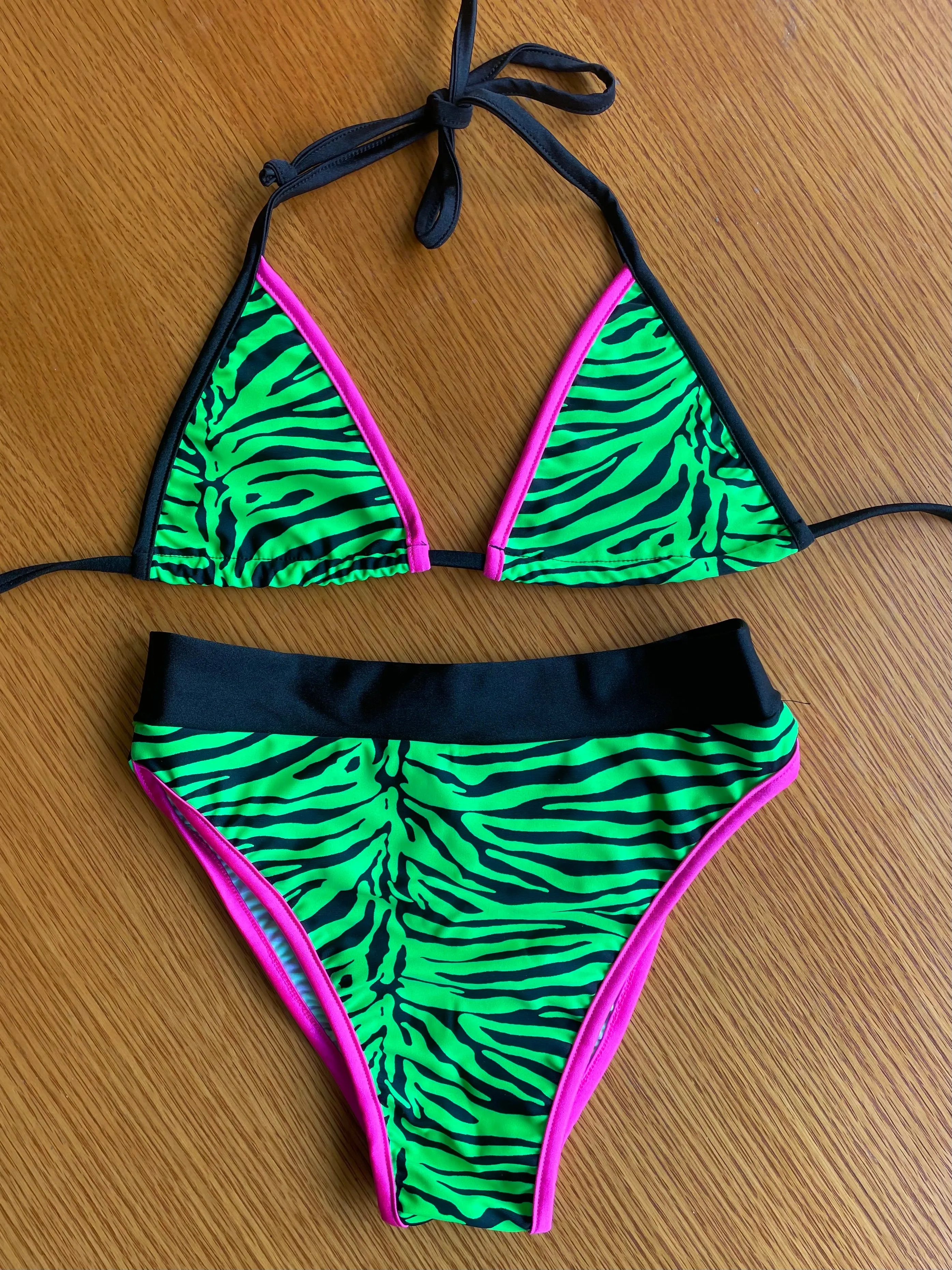 Our new swimsuit has a lined triangle top in neon green zebra lycra with neon pink trim and high waisted, high-cut rio bottoms to make your booty pop. These neons will definitely glow in the black lights at clubs and parties! Perfect for EDC and raves.