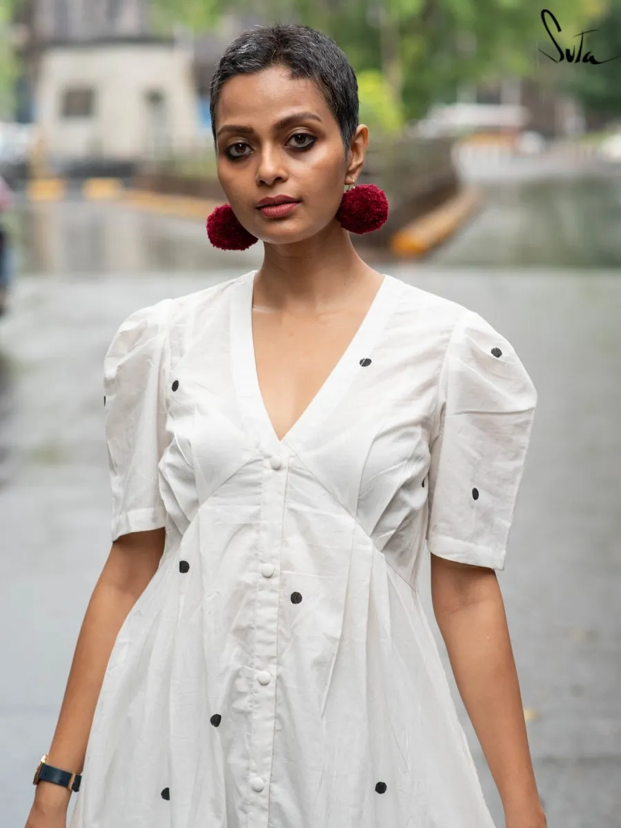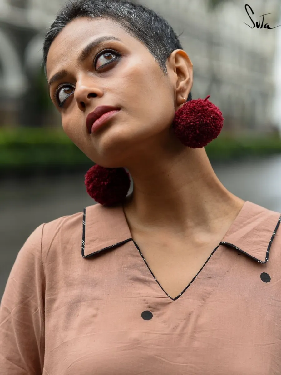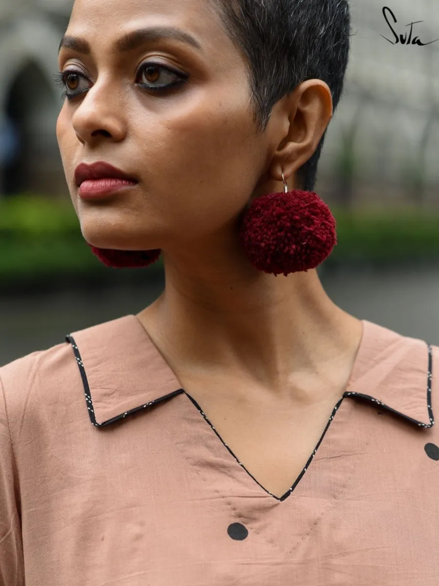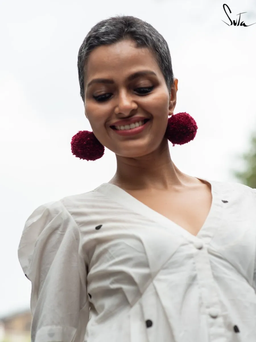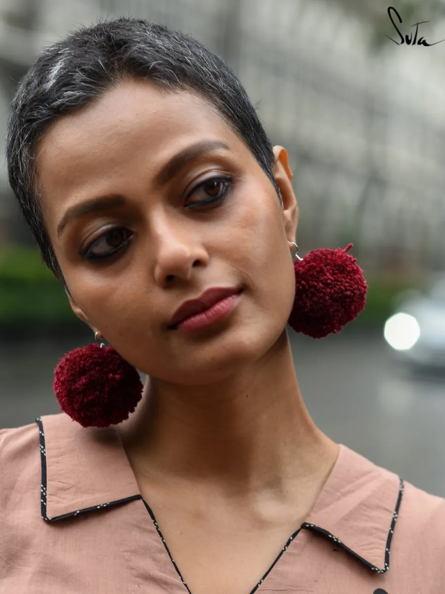 These beautiful pom-pom earrings are inspired by Sutas signature polka dot-pattern. Theyre handmade by our artisans and crafted from the most vibrant wool. Wool is derived from animal hairs. These hairs are spun into yarn. Wool yarn and fabric are known for their durability.