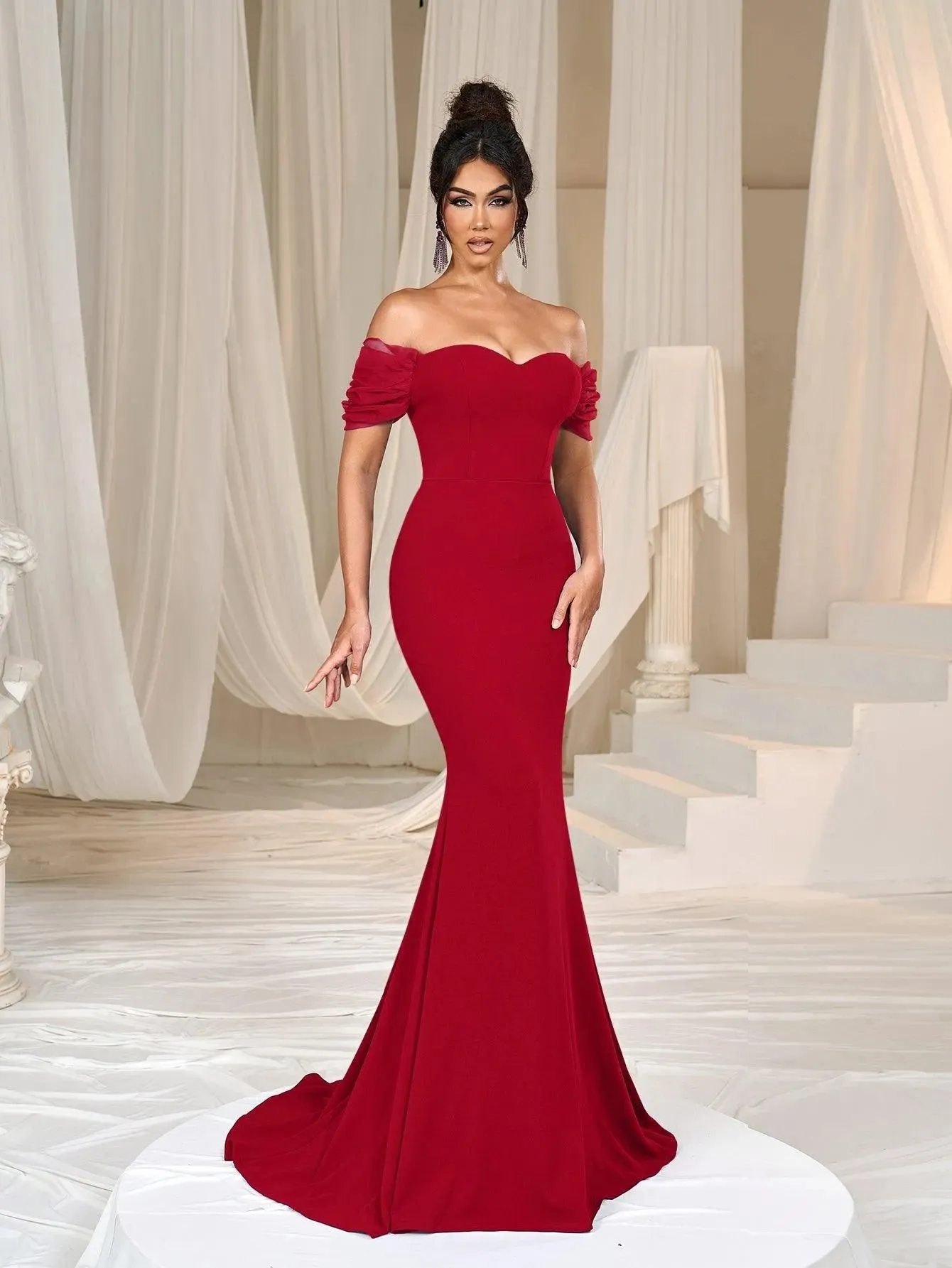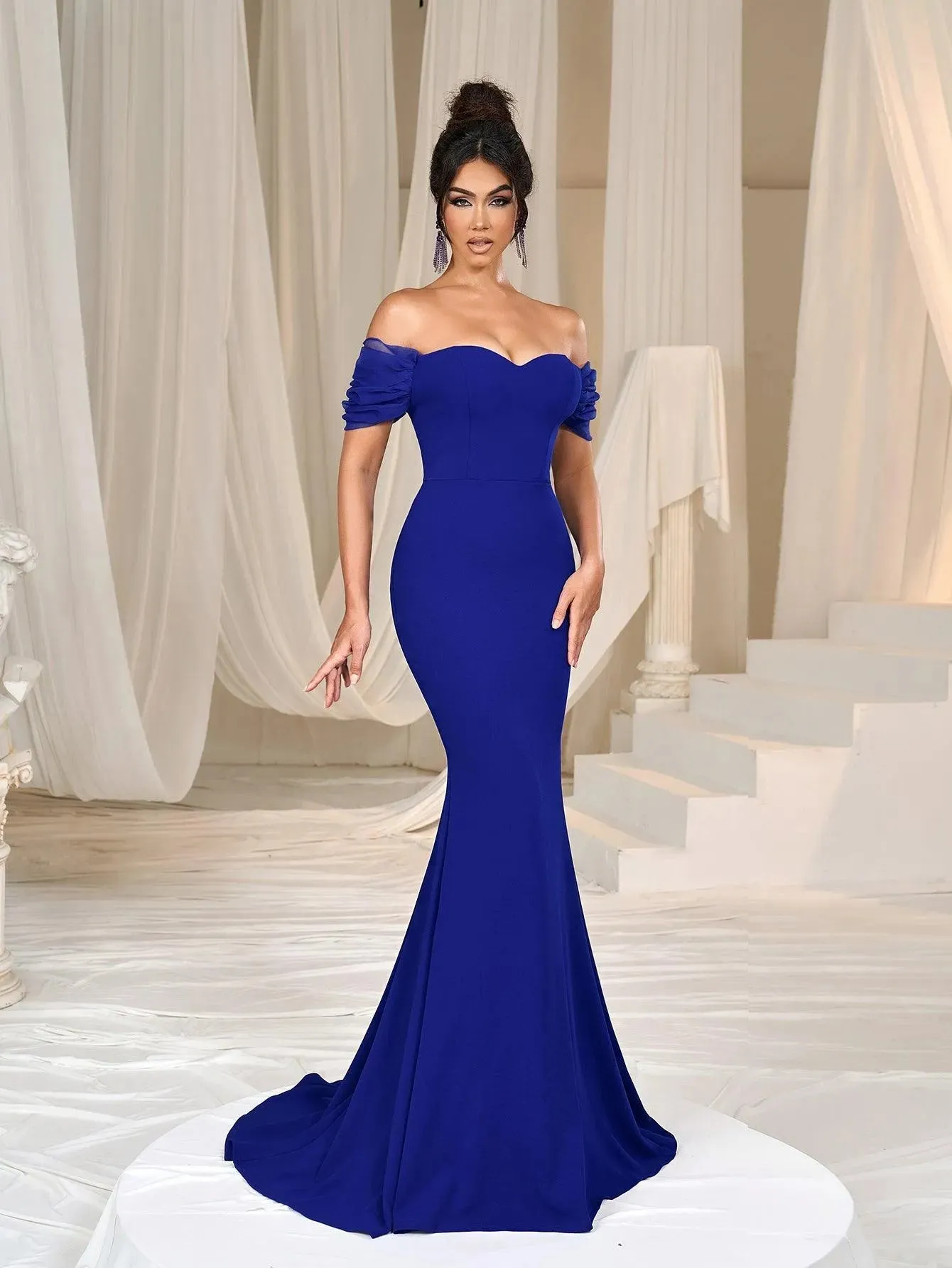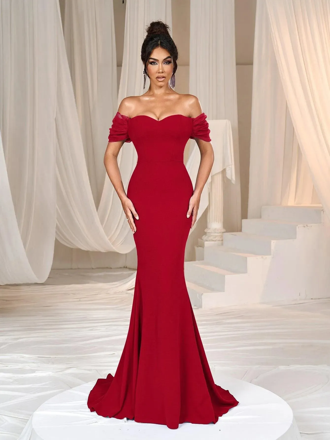 Turn heads at your next event with this luxurious off-shoulder evening gown. Designed for those who love to make a statement, this dress features an elegant sweetheart neckline and a fitted bodice that beautifully accentuates your curves. The floor-length silhouette is enhanced with ruched off-shoulder sleeves, adding a touch of modern sophistication. Made with high-quality fabric, this gown exudes an air of timeless elegance. Perfect for galas, red carpet events, or any special occasion, this gown combines classic glamour with contemporary style.