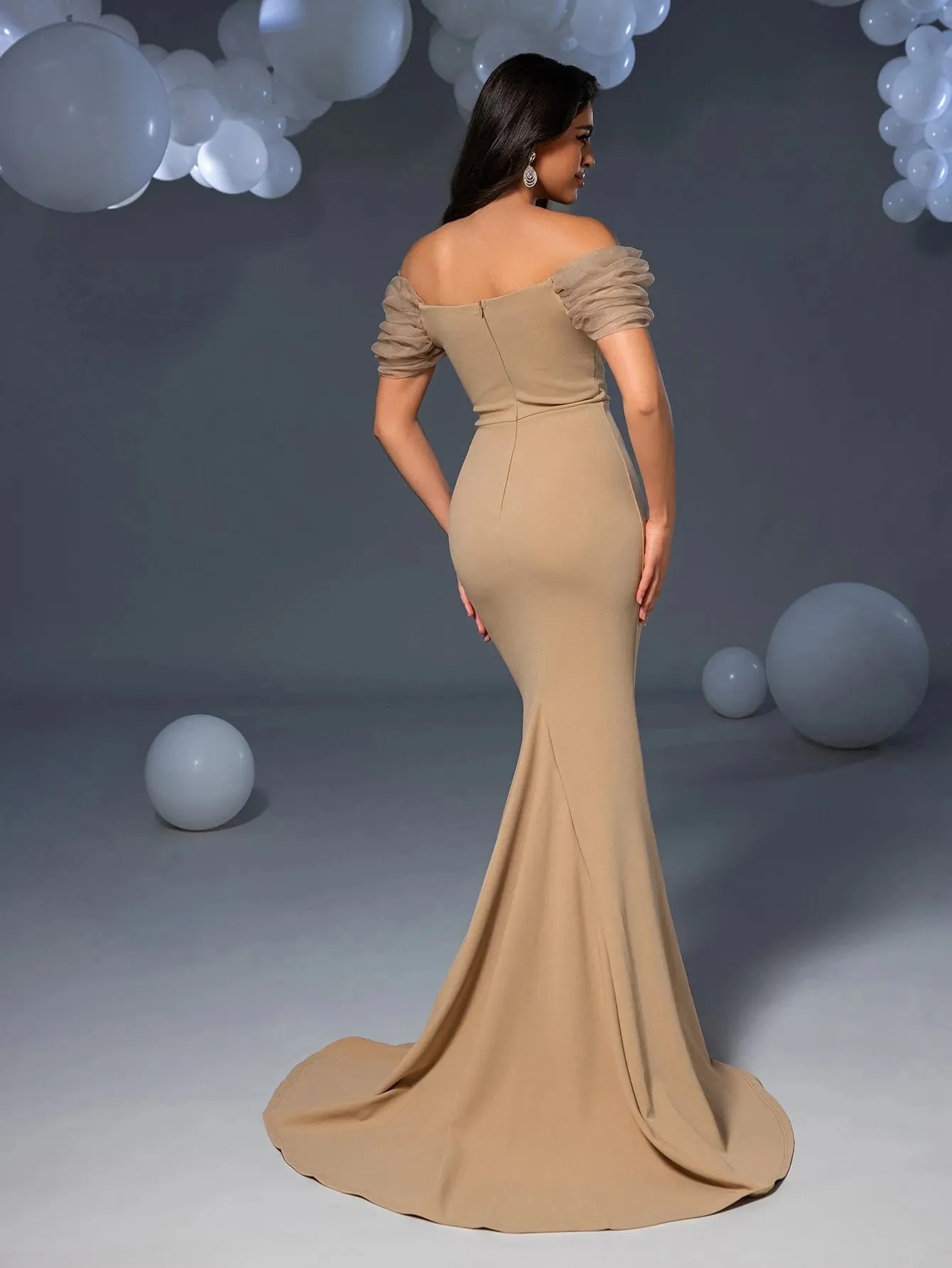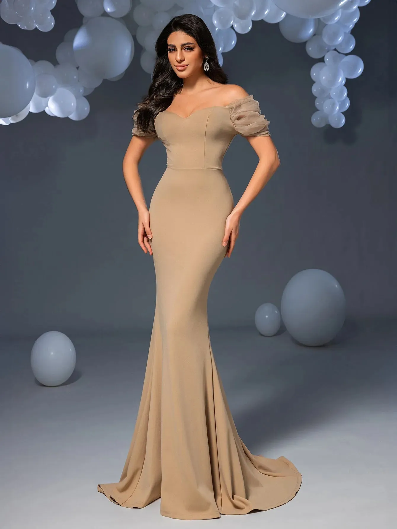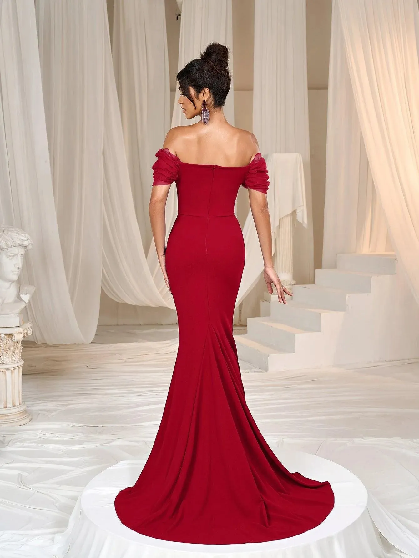 Turn heads at your next event with this luxurious off-shoulder evening gown. Designed for those who love to make a statement, this dress features an elegant sweetheart neckline and a fitted bodice that beautifully accentuates your curves. The floor-length silhouette is enhanced with ruched off-shoulder sleeves, adding a touch of modern sophistication. Made with high-quality fabric, this gown exudes an air of timeless elegance. Perfect for galas, red carpet events, or any special occasion, this gown combines classic glamour with contemporary style.