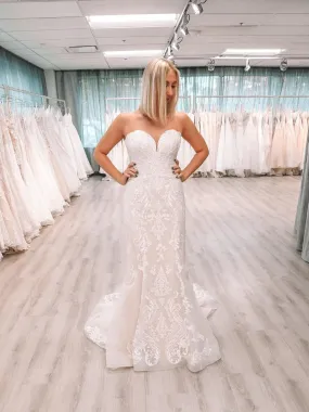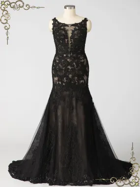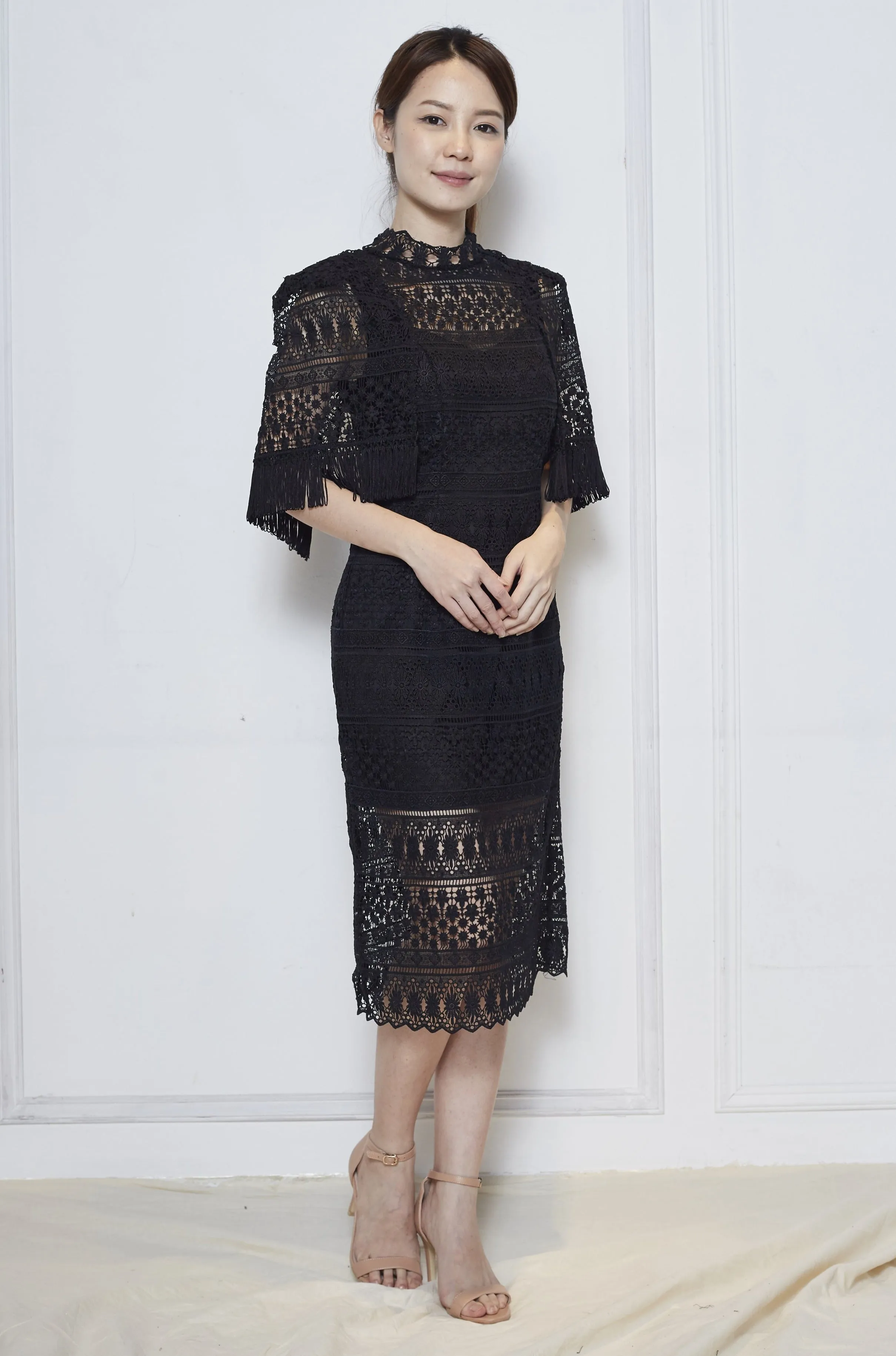This ivory style is lined with nude stretch-jersey to the mid-thigh, then falls to a sheer hemline and has a dramatic cape overlay the sleeves