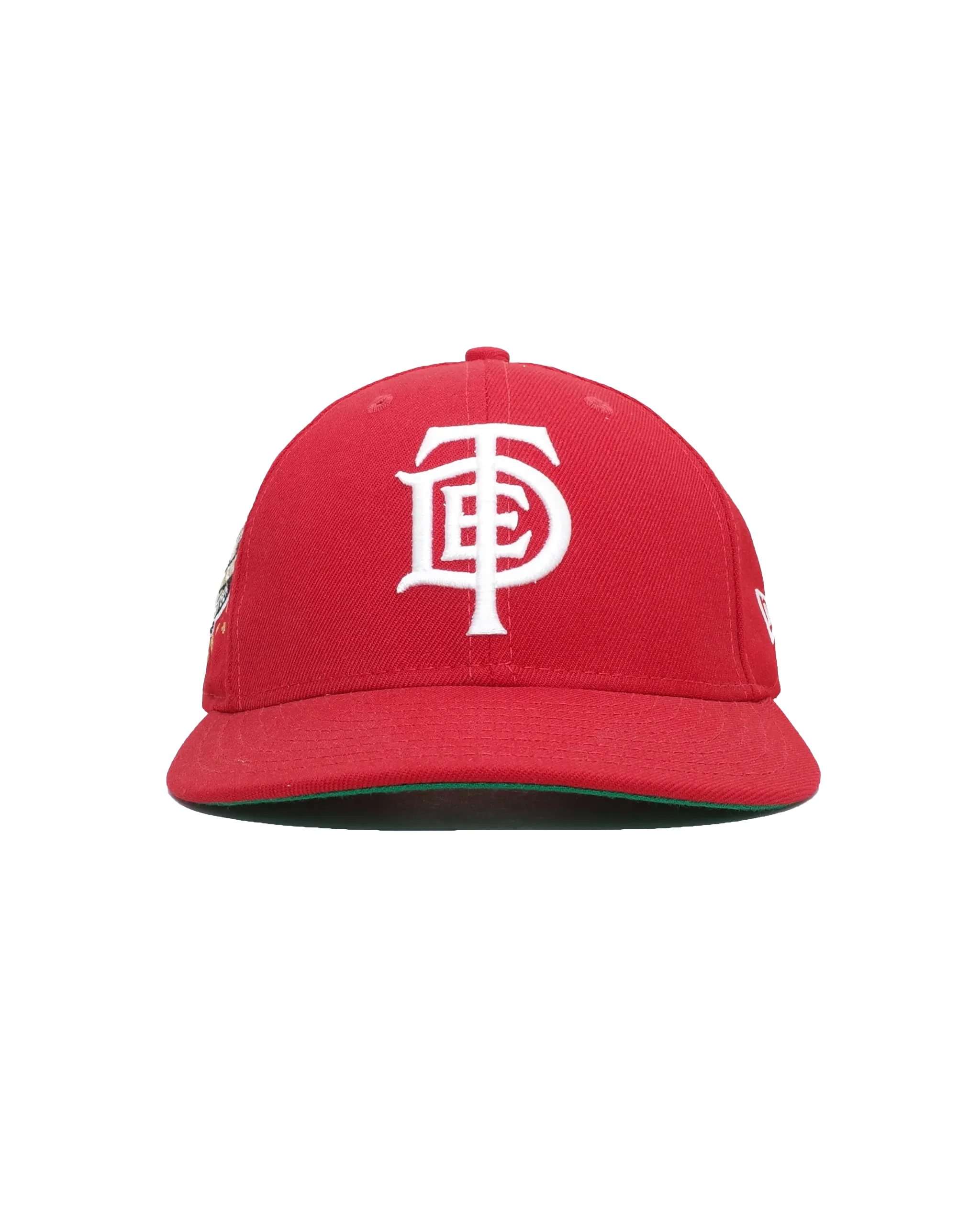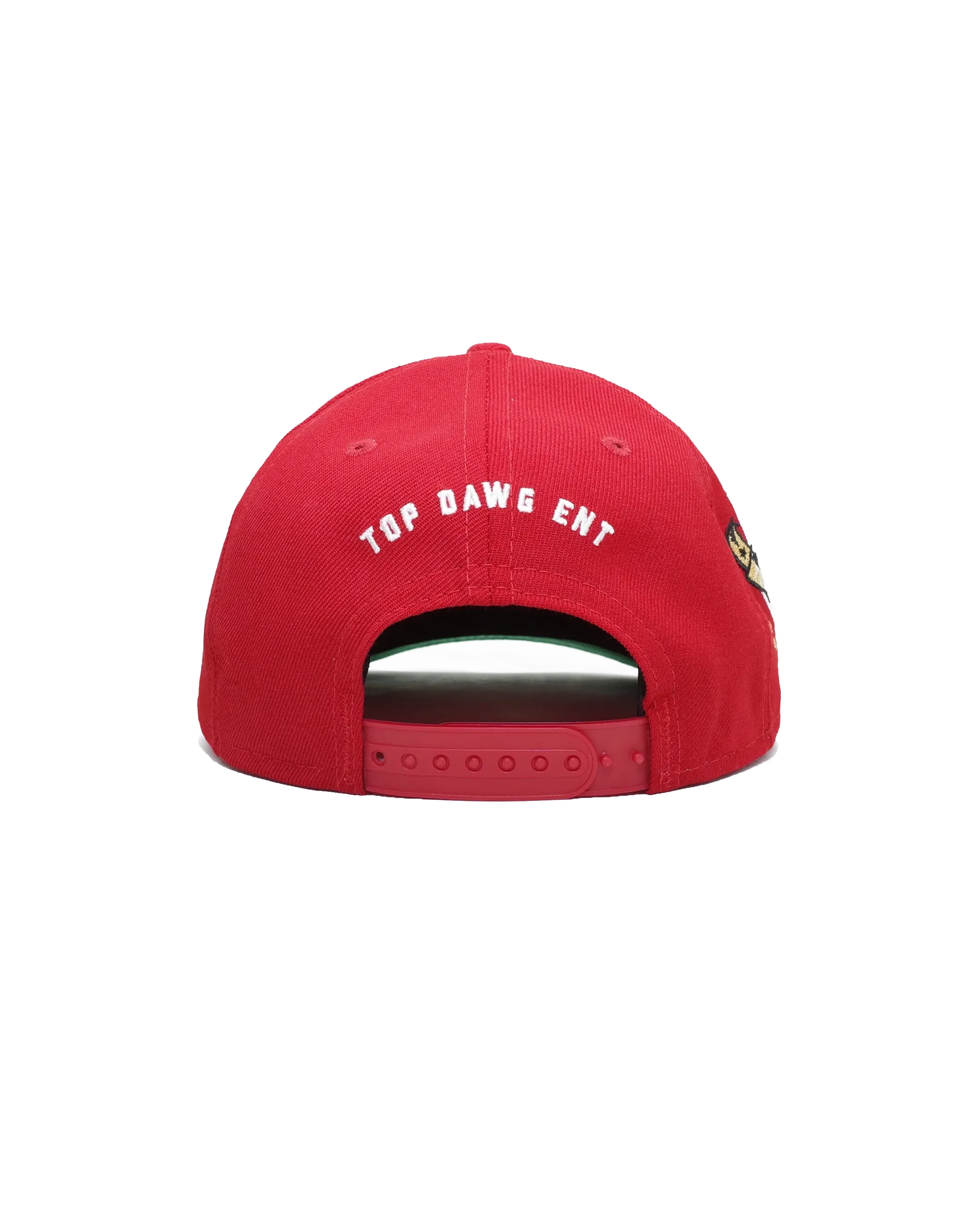 New Era “9FIFTY” low-profile snapback cap in red with pre-curved visor. TDE Championship logo embroidery at front, Championship emblem embroidery at right side, Top Dawg Ent embroidered at back. Tonal stitching. Adjustable snap back closure. Primary: 100% Wool.