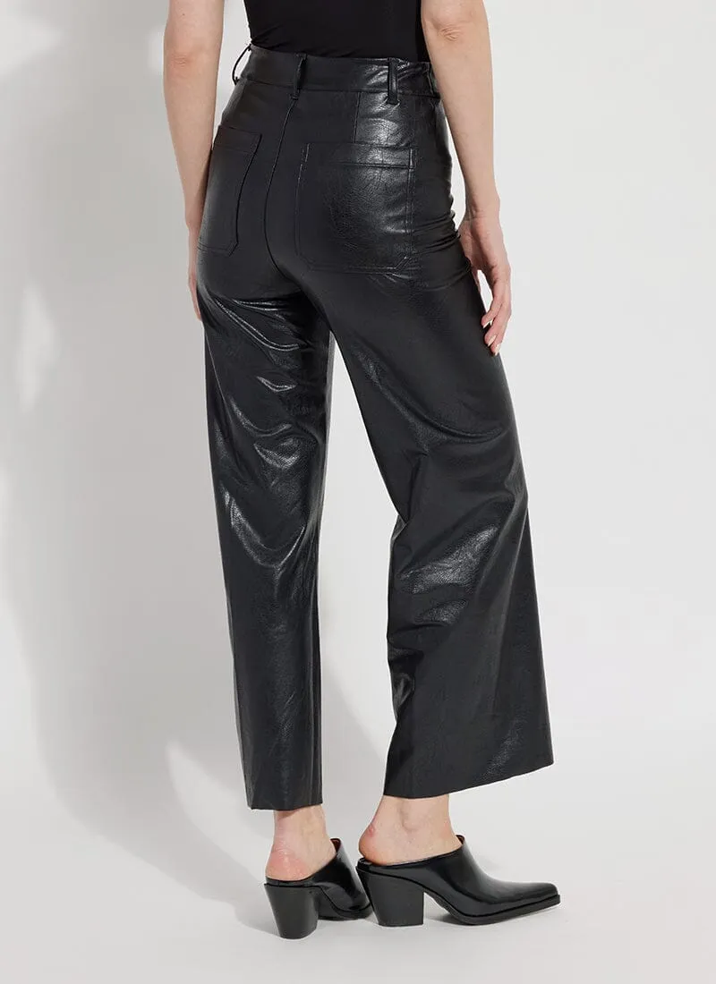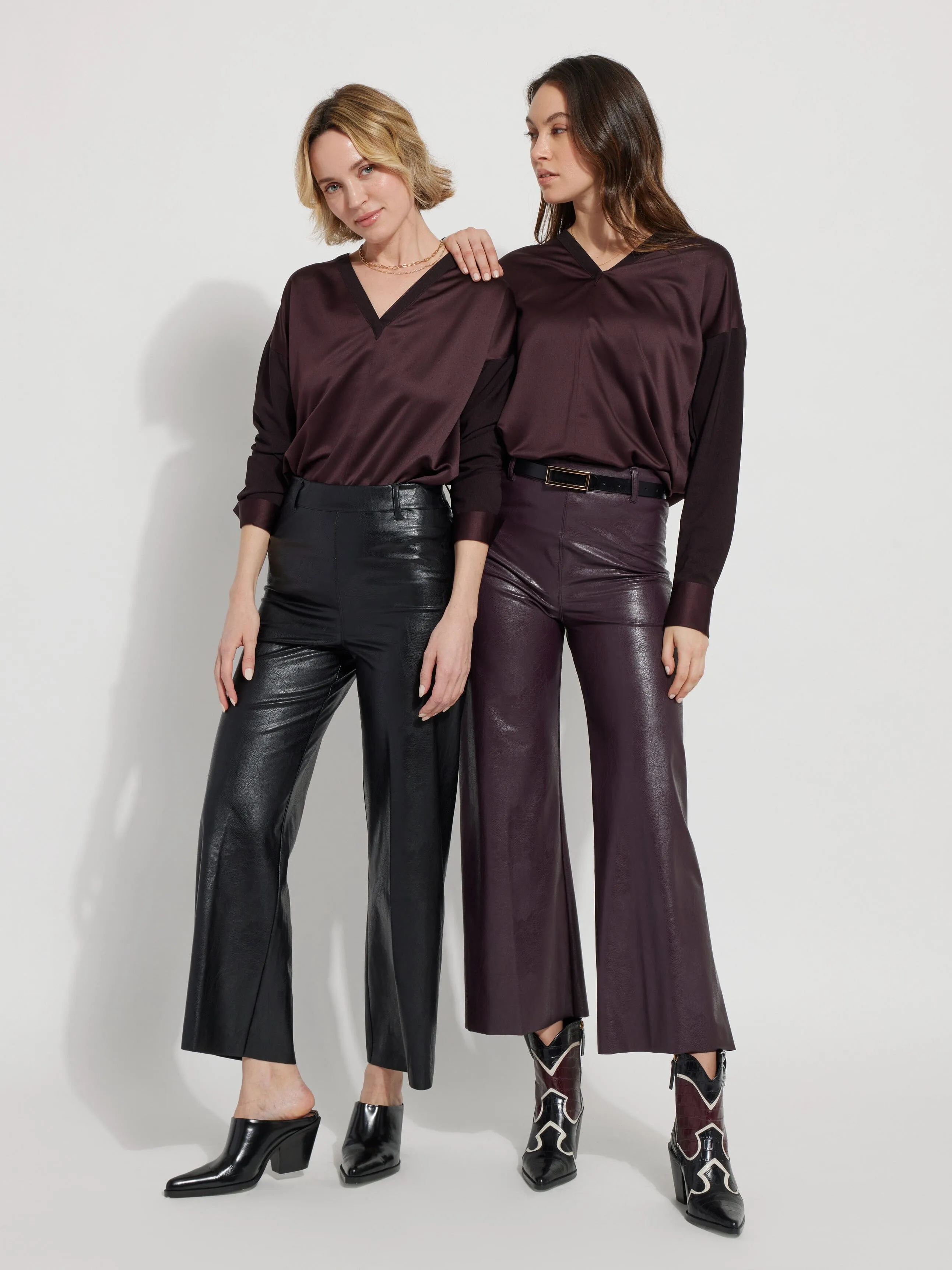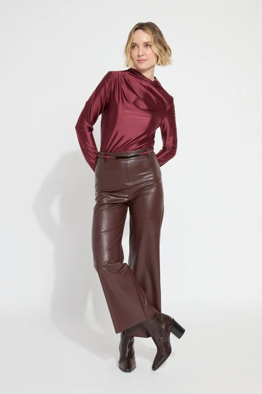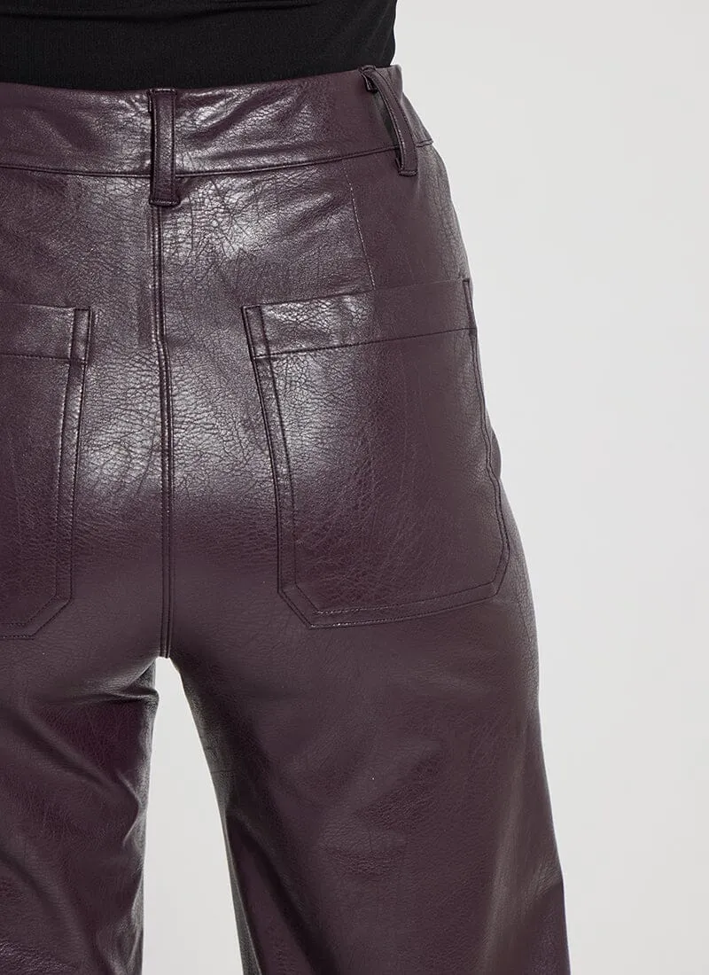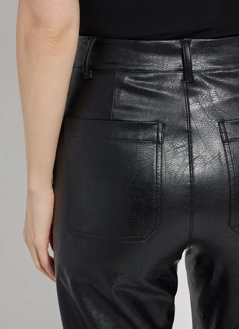 The Hi Waist Vegan Leather Wide Leg pant is fitted at the waist and hip before falling into a wide, ankle-length leg. Made from 4-way stretch Textured Vegan Leather, these wide-legged pants feature a concealed patented waistband, beltloops, patch pockets and no side seam for a slimming look. A raw-edge hem makes them simple to shorten. Partner these faux leather wide-leg pants with a tucked Shalom Satin Jersey Funnel Neck Top and zip up ankle boots.