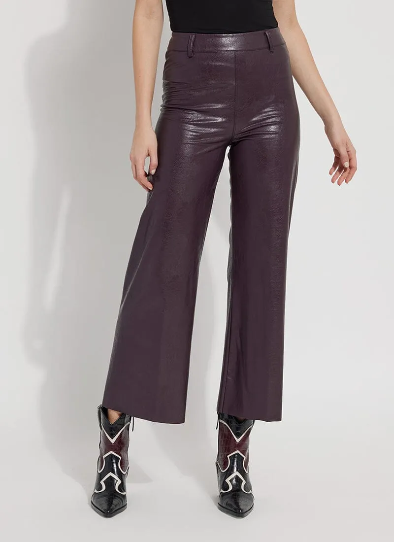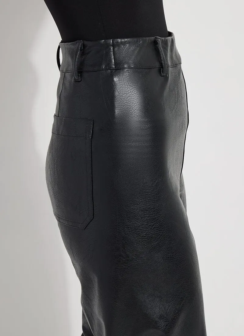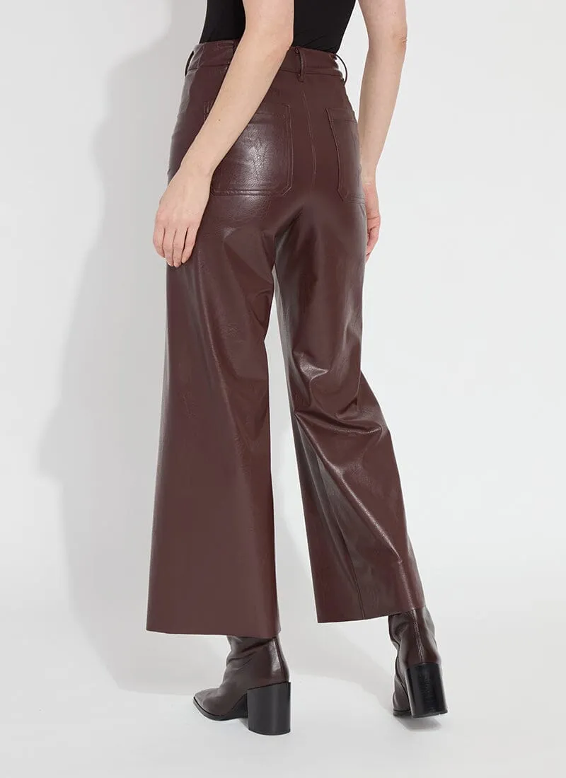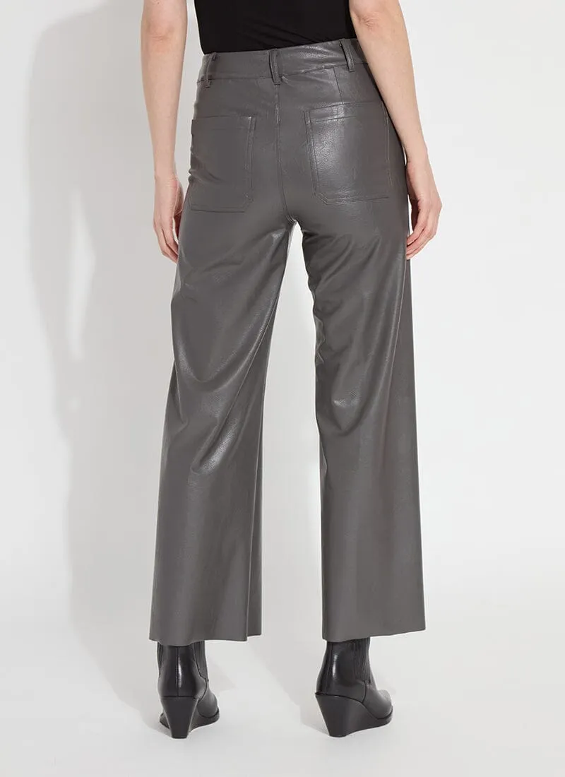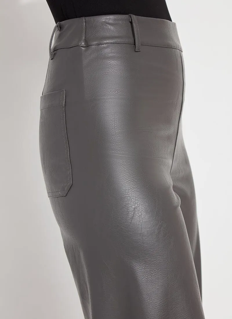 The Hi Waist Vegan Leather Wide Leg pant is fitted at the waist and hip before falling into a wide, ankle-length leg. Made from 4-way stretch Textured Vegan Leather, these wide-legged pants feature a concealed patented waistband, beltloops, patch pockets and no side seam for a slimming look. A raw-edge hem makes them simple to shorten. Partner these faux leather wide-leg pants with a tucked Shalom Satin Jersey Funnel Neck Top and zip up ankle boots.